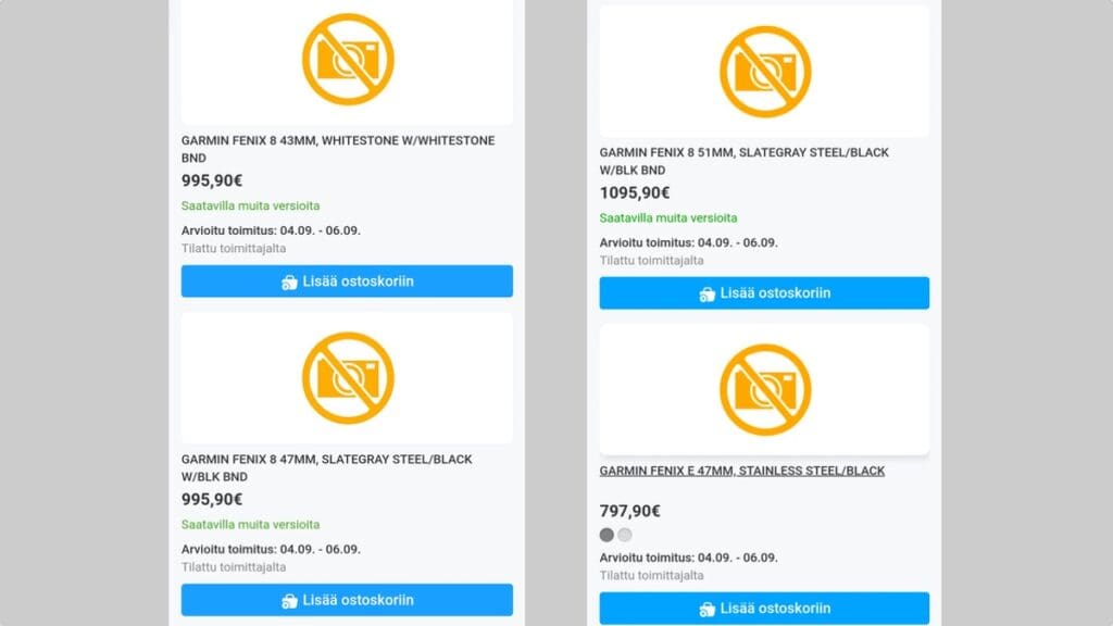 The first is the release date. As shown in the listings below, these are holding pages for the typical range of Fenix models, though the ‘estimated delivery’ (translated from Finnish) is slated for 4-6 September.