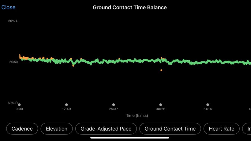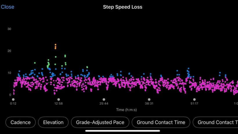 However, in some early tests of the new metric, we’ve found it to be quite helpful in improving our understanding of our running economy. Initially, we weren’t clear on whether this would provide much beyond what GCT (below) shows, but there are solid use-cases for the insight.