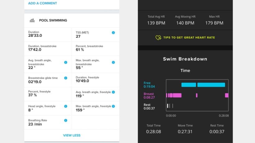 For breaststroke glide time, I learned that a longer glide indicates better technique; however, there’s no way to determine if my glide time was necessarily long enough. This is where the lack of actionable, personalized insights becomes apparent. I’d like to see data presented not only to indicate whether it’s good or bad but also how to make improvements.