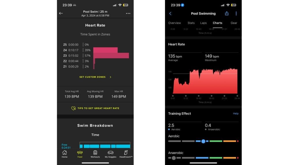 When we compared in real-time during pool sessions, the heart rate data almost always fell in line with the watches. The heart rate graphs for both average and max heart rate readings presented in the post-swim were similar, too.
