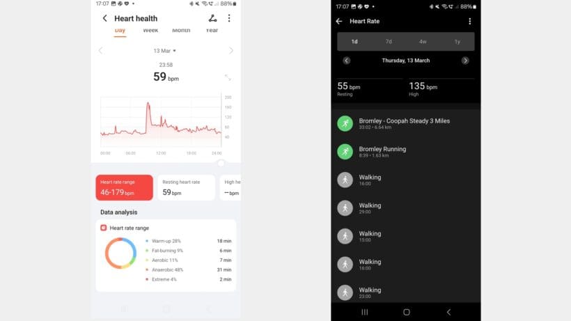It wasn’t a particularly impressive performer in this regard. Daily heart rate readings were higher compared to two other watches we know offer reliable heart rate data. As expected, it didn’t improve much during exercise, where heart rate data was noticeably higher than that from a heart rate monitor chest strap for higher intensity workouts.