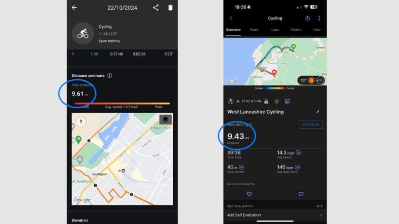 In real-time on those cycling workouts, I consistently found the mile markers buzzing a few seconds before the Garmin Fenix 8 (using its class-leading Multi-Band GNSS mode). When looking at the post-workout data, it generally overestimates to around 10-15 meters per mile.