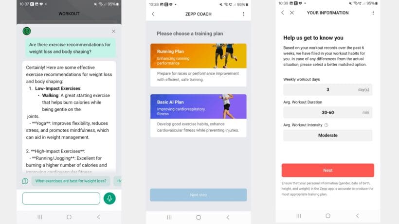 That continues with the Zepp Coach Chat, which takes the form of a chatbot that offers some very dry responses to general fitness and workout queries and might be useful for some beginner users, but it could be presented much more nicely.