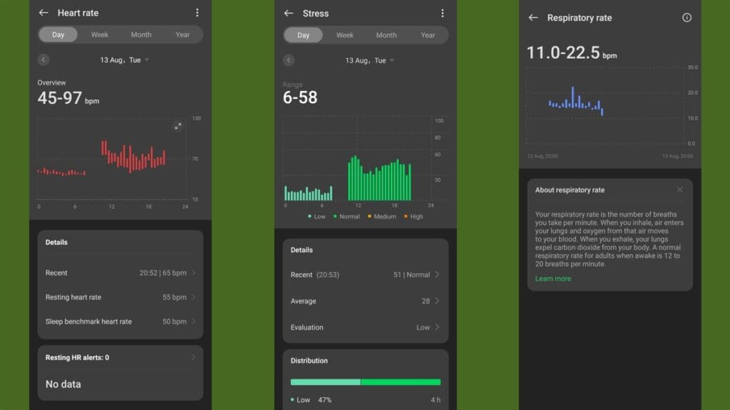 Blood oxygen data (once you turn it on) never had any tell-tale dips below 95%, the 0-100 stress tracking was loosely aligned with Garmin’s similar system, and RHR info was bang on.