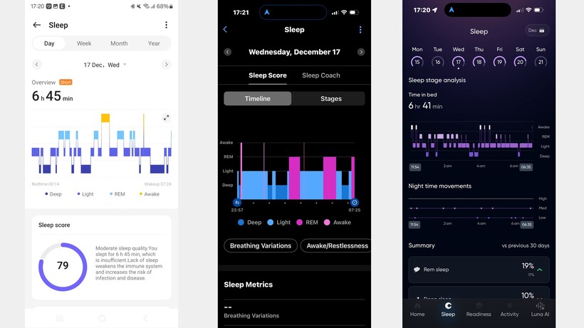 Core sleep stats like sleep duration, times fallen asleep and woken up, and sleep stages like REM and deep sleep told a similar story to the other sleep trackers we also strapped on. Overall sleep scores tended to trend lower, often suggesting we didn’t always have great nights of sleep, even on nights when we felt we’d slept well.