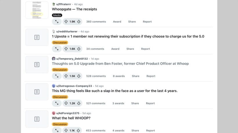 When the initial 5.0 upgrade requirements were different—again, Whoop has now changed them, as we’ll get into below—those who had recently renewed or signed up for long-term memberships felt aggrieved. The expectation of many was that they wouldn’t be asked to commit even longer to gain the new hardware.