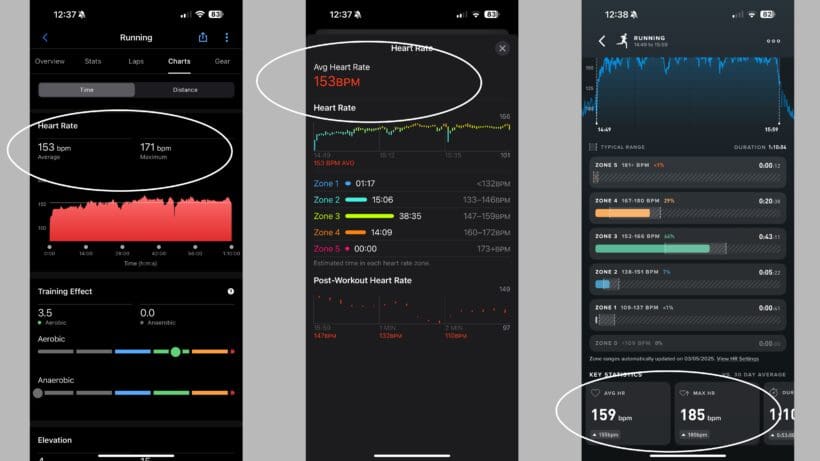 A seven-mile, steady-paced run yielded an average of 153 BPM from the Garmin HRM-Pro Plus—widely considered the gold standard—and the Apple Watch Ultra 2, while the Whoop MG was surprisingly higher at 159 BPM. Another five-mile run with a longer middle interval was similar: Whoop MG at 165 BPM average, with the Apple Watch at 160 BPM and the Garmin chest strap at 161 BPM.